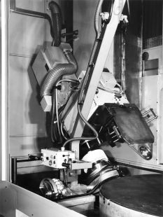Die Schleif­spindel incl. Antrieb kann mittels Schnecken­rad Getriebe um 360 Grad geschwenkt werden. Die Profilier-Einheit schwenkt um die Achse der Schleif­spindel. Diese Funktionen waren Bedingung um geo­metrisch komplexe Bauteile fertigen zu können.