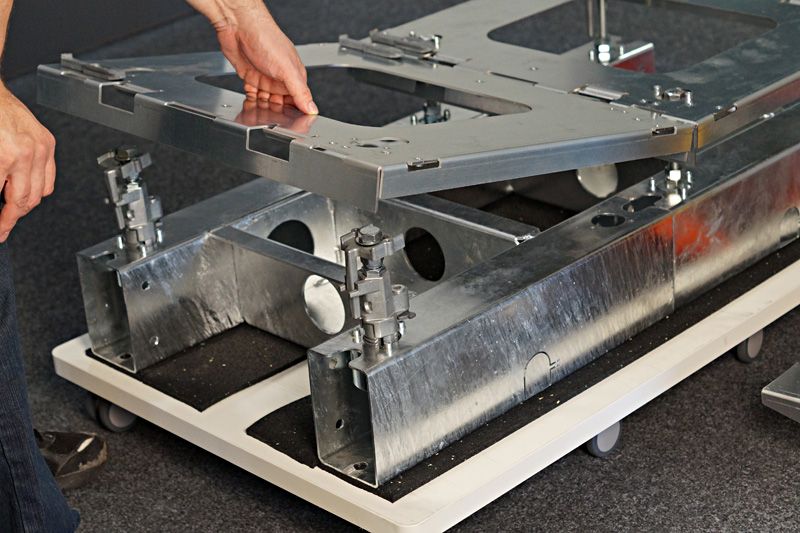 Mit der gezeigten Schnell­justie­rung und ein­steck­bare Sockel Ele­mente, welche die Waren­entnahme­station aufnehmen, wird die Auf­bau­zeit und das Gewicht der Sockel, deutlich reduziert. Auf­wän­diges Aus­richten und Fixieren von Justier.- und Ver­bindungs­elemen­ten entfällt.